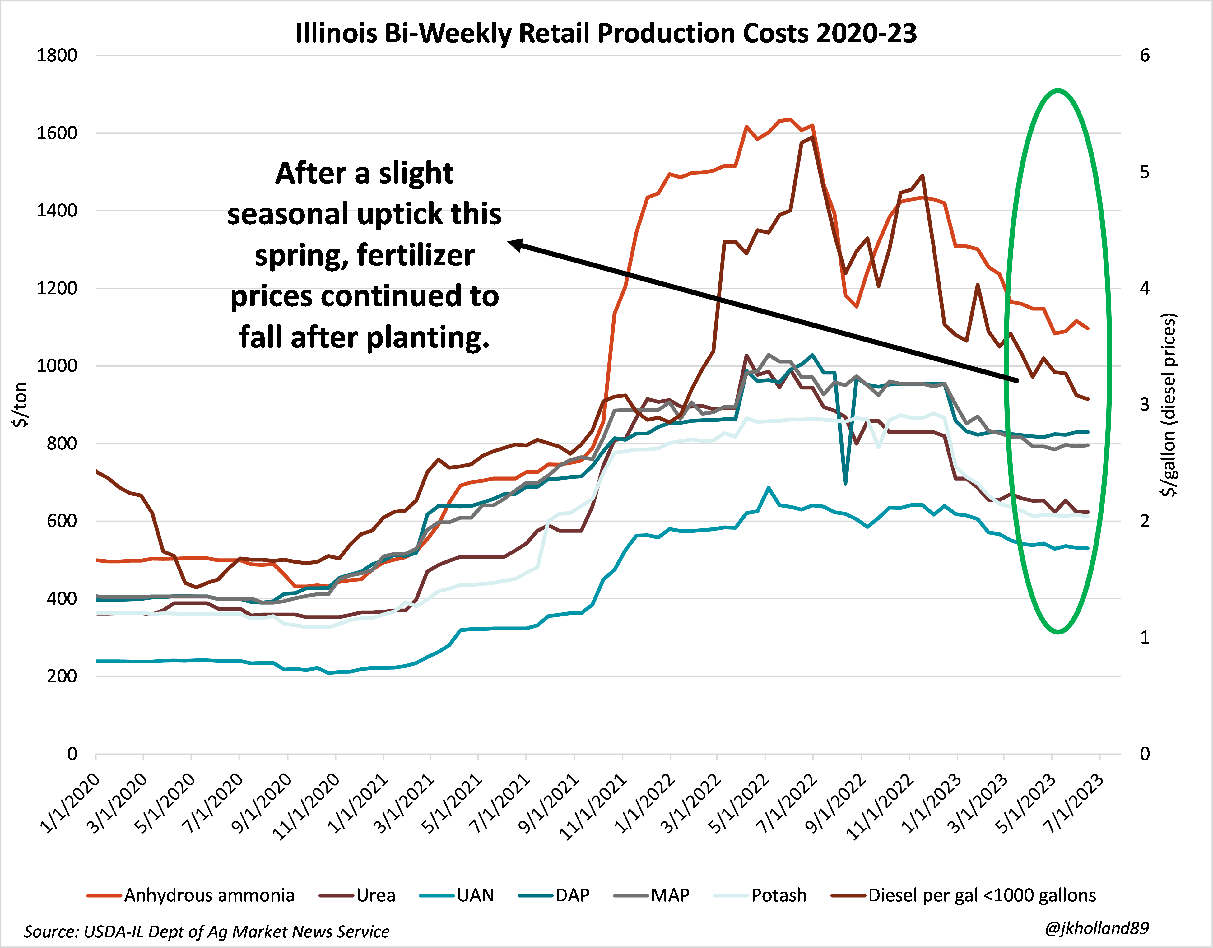 Fortunately, fertilizer inputs have cooled a bit from those historical highs and may have a chance to decline further this year.